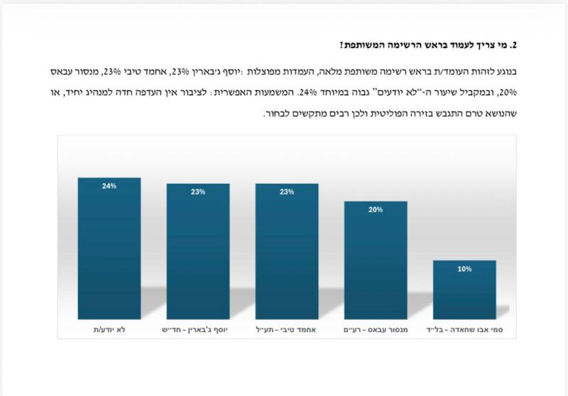 وحول من يجب أن يكون برئاسة القائمة المشتركة في حال تمّ إقامتها، حصل كل من النائب السابق د. يوسف جبارين والنائب د. أحمد الطّيبي على نسبة متساوية (23%)، بينما حصل النائب د. منصور عبّاس على نسبة 20%، وحصل النّائب السابق سامي أبو شحادة على 10% .