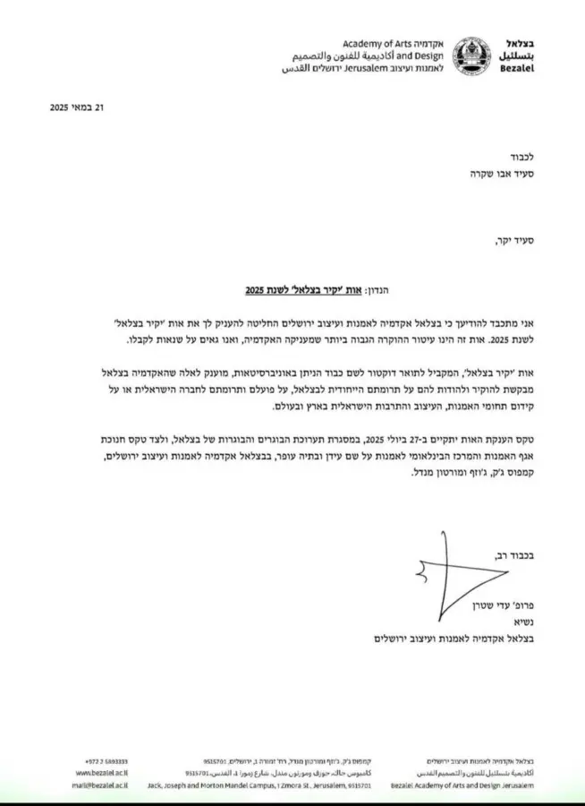 هذا، وجاء في رسالة اكاديمية “بتسلئيل” للفنون والتصميم بالقدس الموقعة من قبل رئيس الأكاديمية البروفيسور عدي شطيرن: “يشرفني أن أبلغكم أن أكاديمية بتسلئيل للفنون والتصميم في القدس قررت منحك جائزة “عزيز بتسلئيل” لعام 2025. وهذه الجائزة هي أعلى وسام تمنحه الأكاديمية سنويًا، ونحن فخورون بحصولك عليها”.
