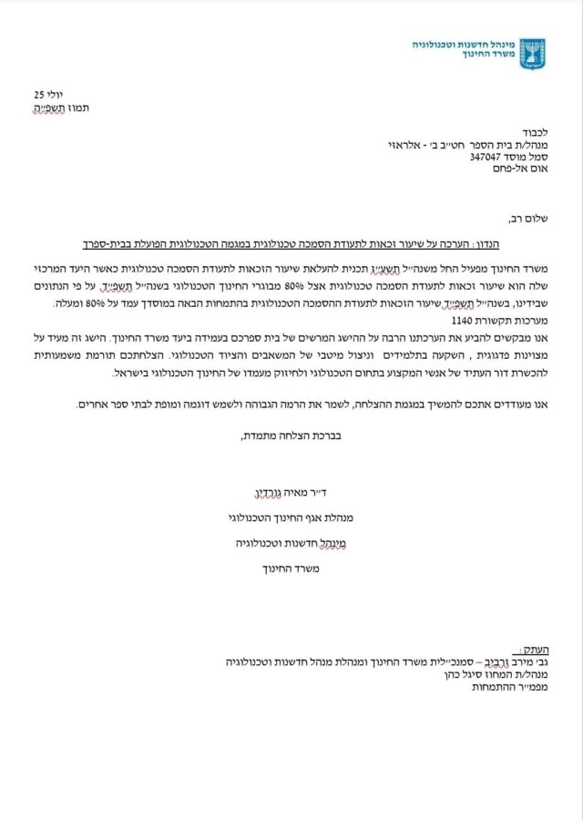 مدرسة الرازي في ام الفحم تحقّق إنجازًا نوعيًا في التعليم التكنولوجي: شهادة تقدير من وزارة المعارف وثمار سنوات من العمل الجاد