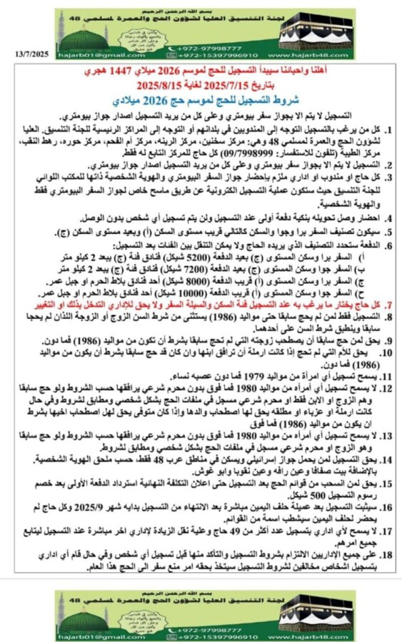 - كل من يرغب بالتسجيل التوجه إلى المندوبين في بلدانهم أو التوجه إلى المراكز الرئيسية للجنة التنسيق العليا الشؤون الحج والعمرة لمسلمي 48. وهي: مركز سخنين، مركز الرينة، مركز أم الفحم، مركز حورة، رهط النقب، مركز الطيبة (تلفون للاستفسار: 09/7998999) كل حاج للمركز التابع له فقط.