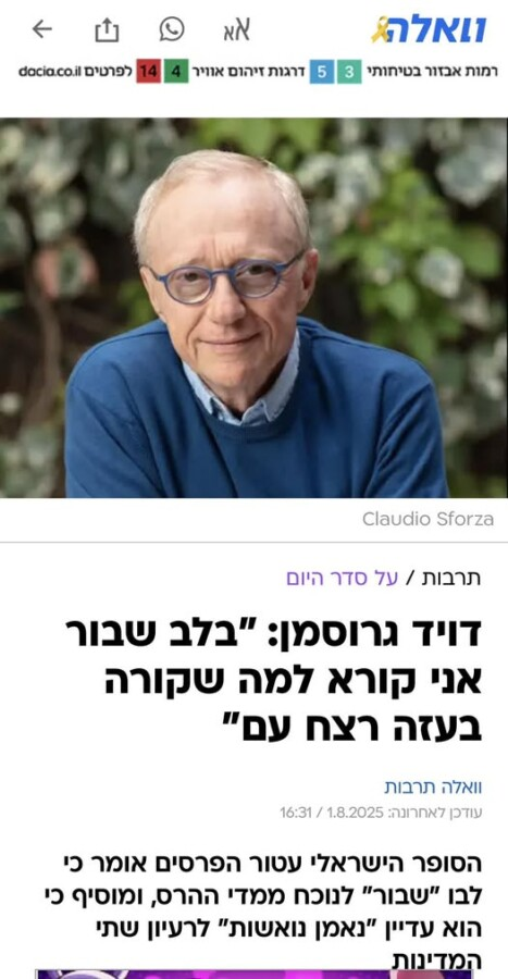 وفي التفاصيل، وبحسب ترجمة عن “هآرتس” (نقلًا عن “الغارديان” البريطانية يوم 3/8/2025)، قال ال الكاتب دافيد غروسمان – في مقابلة مع الصحيفة الإيطالية “لا ريبوبليكا” – إن إبادة جماعية تجري في قطاع غزة، وشرح الحائز على جائزة إسرائيل في الأدب بأنه لم يكن مستعداً لاستخدام هذه الكلمة، “لكن لا بد من استخدامها الآن، خصوصاً بعد ما قرأته في الصحف، وبعد الصور التي رأيتها، وبعد أن تحدثت مع أناس كانوا هناك. بألم شديد وقلب متفطر، ملزم أن أرى ما يجري أمام عيني”.