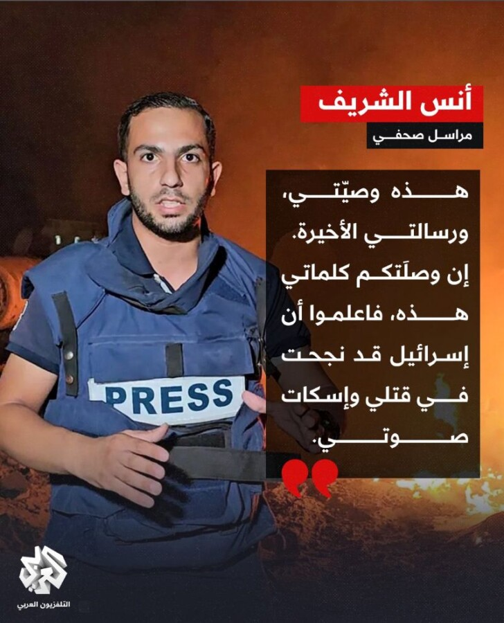 أفادت مصادر محلية في غزة باستشهاد أعضاء طاقم قناة “الجزيرة”، وهم: أنس الشريف، ومحمد قريقع، والمصورين إبراهيم ظاهر، ومؤمن عليوة، ومحمد نوفل، إثر قصف الجيش الإسرائيلي خيمة الصحافيين امام مستشفى الشفاء بغزة، في ساعة متأخرة من ليلة الاحد / الاثنين، في جريمة نكراء لاقت ردود فعل مستنكرة في انحاء العالم.