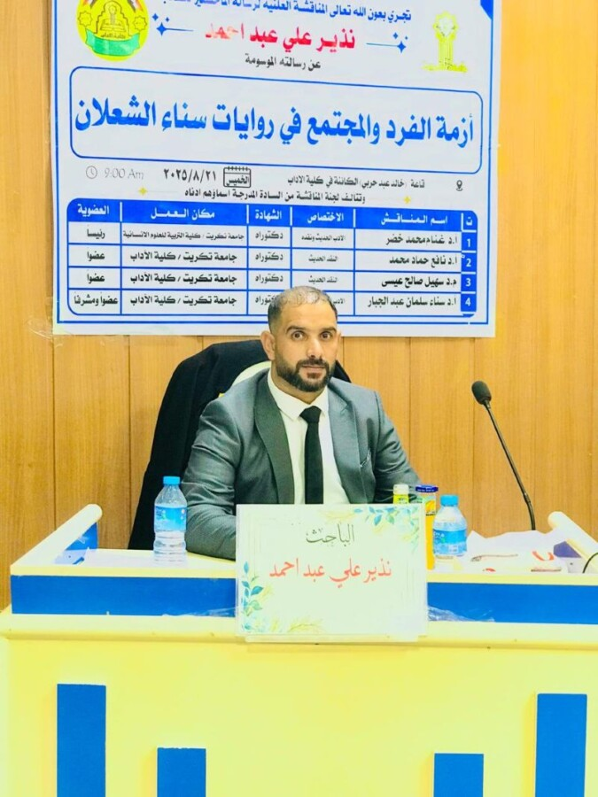 تكريت/ العراق: ناقش الباحث العراقيّ نذير علي عبد أحمد رسالته الماجستير في كليّة التّربية للعلوم الإنسانيّة، في جامعة تكريت، في مدينة تكريت في العراق استكمالاً لمتطلبات الحصول على درجة الماجستير في الآداب، وهي بعنوان: “أزمة الفرد والمجتمع في روايات سناء الشّعلان”، وهي تدرس روايات الأديبة الأردنيّة ذات الأصول الفلسطينيّة أ. د. سناء الشّعلان (بنت نعيمة) في دراسة نقديّة متخصّصة تحت موضوع العنوان.