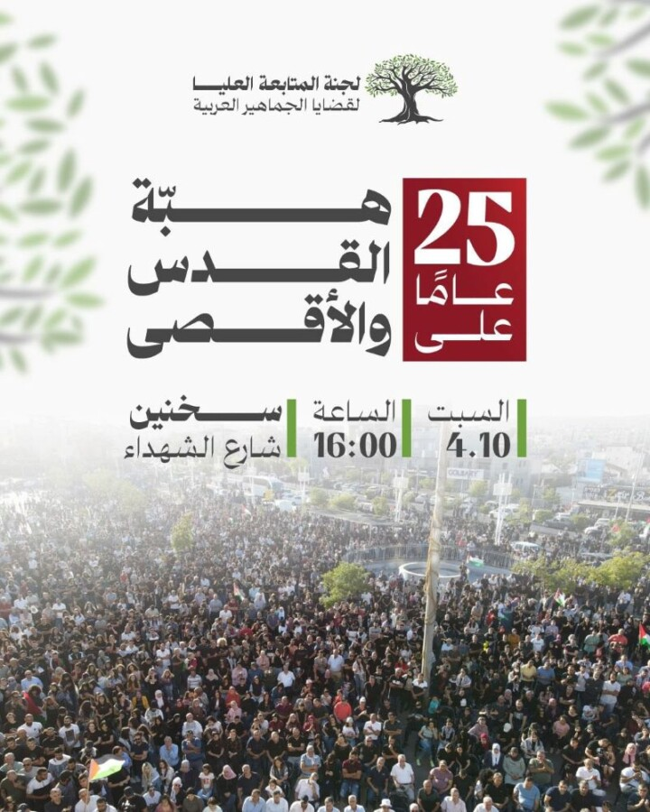 وفي السياق، دعت لجنة المتابعة العليا الجماهير العربية، والقوى التقدمية المناهضة للحرب والاحتلال، المركزية، إحياء الذكرى الـ25 لهبة القدس والأقصى، التي ستُجرى في سخنين، الساعة الرابعة من عصر يوم السبت القريب، 4 تشرين الأول/ أكتوبر، وتسبقها ابتداء من صباح اليوم ذاته، مسيرة زيارة أضرحة الشهداء الـ 13، والنصب التذكارية.
