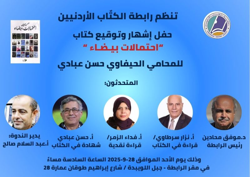 وقّع الكاتب المحامي الحيفاوي حسن عبادي كتابه الجديد “احتمالات بيضاء-قراءات في أدب الحرية الفلسطيني” على منصة التوقيع في أروقة معرض الكتاب الدولي في عمان، وذلك يوم الجمعة 26/9/2025، ليتبع ذلك احتفاليتان مستقلتان لإشهار الكتاب، حضرهما جمع من الكتاب والمثقفين والمهتمين بأدب الحريّة، كانت الأولى في مقر رابطة الكتاب الأردنيين في إربد يوم السبت 27/9/2025، شارك فيها نخبة من الكتاب والأدباء، بالإضافة إلى عريف الحفل الروائي محمد مجدلاوي، مرحبا بالضيوف، ومعرّفا بالكتاب.