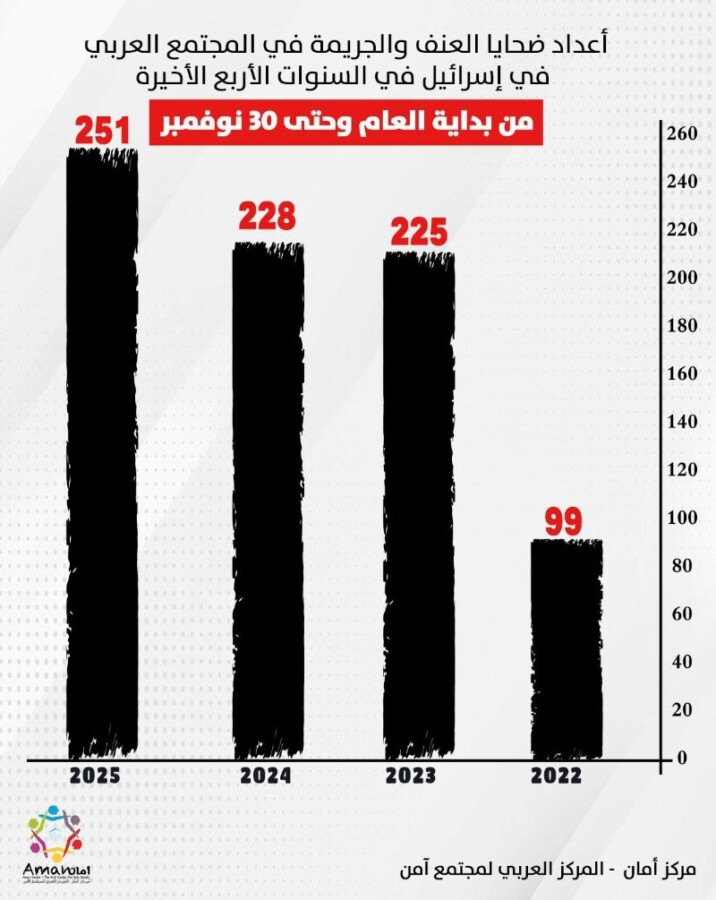 وتُظهر بيانات مركز أمان أن السنوات الأخيرة حملت منحنى تصاعدياً خطيراً في أعداد الضحايا. ففي حين كان عدد الضحايا عام 2022 حتى 30 نوفمبر 99 قتيلاً، شهد عام 2023 قفزة هائلة وصلت إلى 225 ضحية حتى نهاية نوفمبر، ثم ارتفع بعدها العدد مجدداً في 2024 ليبلغ 228 ضحية. أمّا هذا العام، 2025، فقد بلغ عدد الضحايا حتى نهاية نوفمبر 251 ضحية، وهو رقم قياسي الأعلى على الإطلاق في أعداد الضحايا.