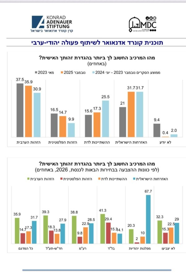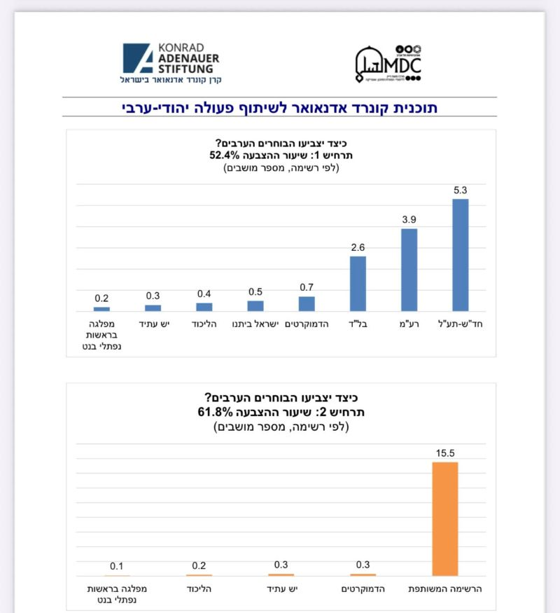 * أغلبية كبيرة (77.4%) من الناخبين العرب تؤيد انضمام حزب عربي إلى الحكومة التي ستُشكل بعد الانتخابات القادمة: 45.6% يؤيدون الانضمام إلى أي حكومة تُشكل، و31.8% يؤيدون الانضمام إلى حكومة يسار وسط. وهذه النسب مماثلة لنتائج استطلاعات سابقة أجراها برنامج كونراد أديناور خلال الحرب.