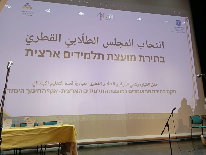 نظّم قسم التعليم الابتدائيّ العربيّ في وزارة المعارف انتخابات مجلس الطلّاب القطريّ في المدارس الابتدائيّة العربيّة، بقيادة د. أميرة حايين وبحضور السيّدة حانا لالوش مديرة قسم التعليم الابتدائيّ، وشراكة السيّدة شيرين حافي- ناطور مديرة قسم كبير للتعليم العربيّ والبدويّ والسيّد جلال الصفدي مدير قسم التعليم اللامنهجيّ في المجتمع العربيّ، كذلك بشراكة مع د. تسيونا ليفي مدير قسم أ اللّغات، د. لبنى حديد مفتّشة تدريس اللّغة العربيّة والسيّدة نغم رابي مفتّشة تدريس اللّغة العبريّة.