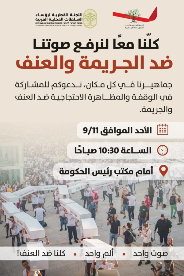** المظاهرة تأتي لتأْكيد تحميل الحكومة وأجهزتها مسؤولية انتشار الجريمة في المجتمع العربي دعت اللجنة القطرية لرؤساء السلطات المحلية العربية…