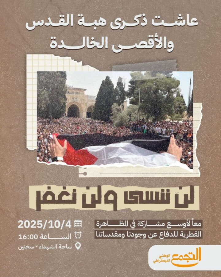 التجمّع: الذكرى الـ25 لهبّة القدس والأقصى مناسبة لتوحيد الصفوف ضد الإبادة والتهجير والضم*