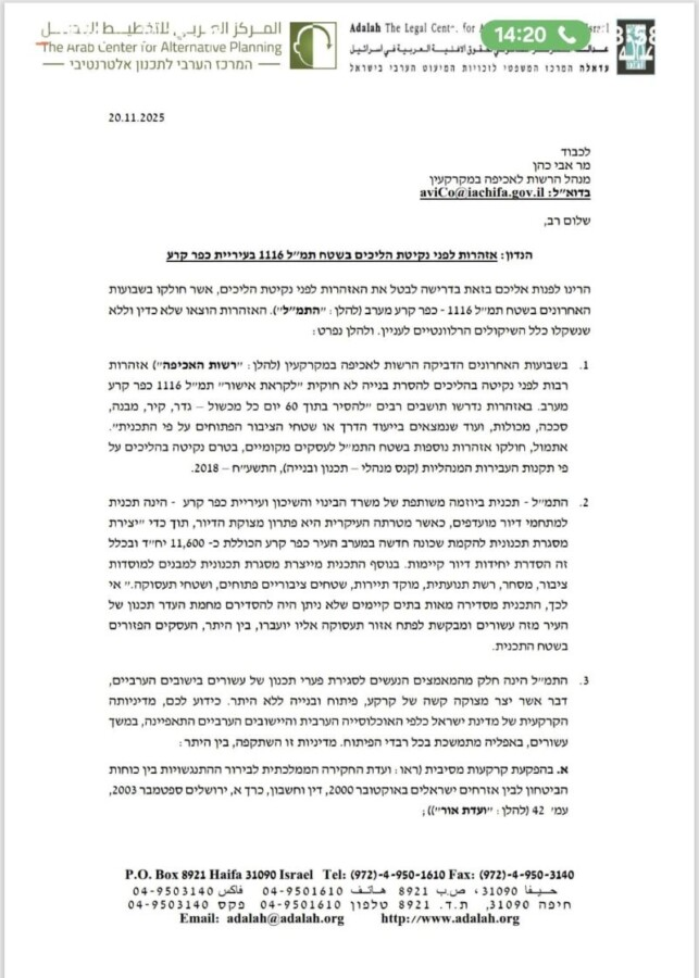 عدالة ومركز لتخطيط البديل بالتعاون مع بلدية كفر قرع في رسالة عاجلة لسلطة التنفيذ: أوقفوا إشعارات الهدم في المدينة