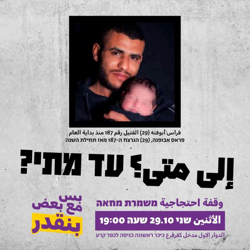 مساء اليوم في كفر قرع: تنظيم مظاهرة احتجاجية لمناهضة العنف والجريمة بالمجتمع العربيّ عقب مقتل الشّاب فراس أبو فنة